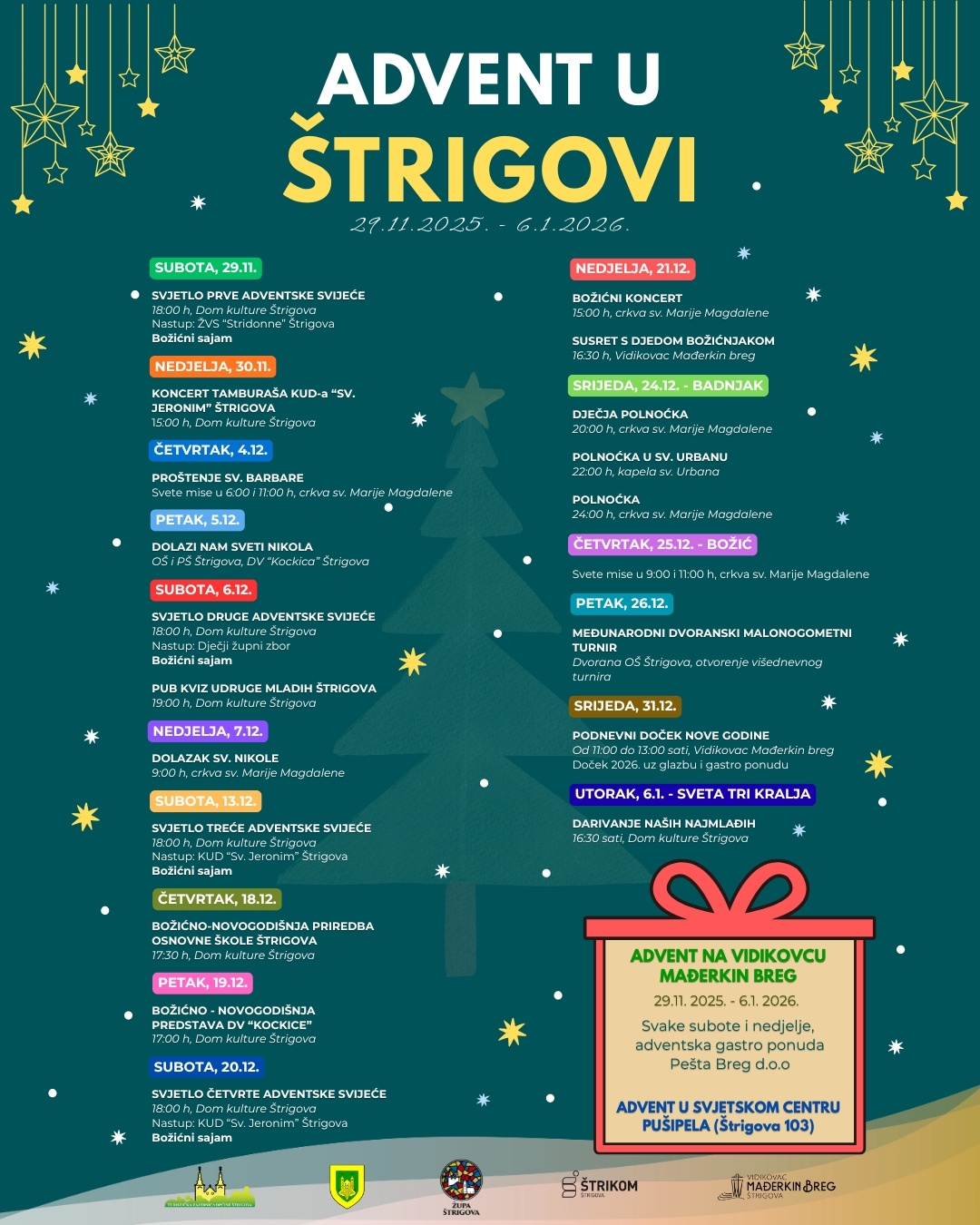 Doživite čaroliju adventa u Štrigovi i na Vidikovcu Mađerkin breg! I ove godine blagdansko vrijeme donosi bogat i raznolik program, ispunjen glazbom i okusima domaćih delicija, dok kulturni i vjerski sadržaji stvaraju toplu i obiteljsku atmosferu za sve posjetitelje, velike i male.