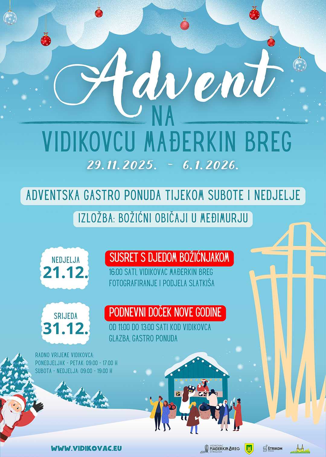 Poseban doživljaj pruža Mađerkin breg, koji se tijekom adventskog razdoblja pretvara u pravo blagdansko odredište. Vidikovac je otvoren svakoga dana, pa posjetitelji mogu uživati u pogledu na zimski krajolik te razgledati izložbu posvećenu božićnim međimurskim običajima. U blagdanskoj gastronomskoj ponudi moguće je uživati tijekom adventskih vikenda, kada Mađerkin breg posebno oživi uz mirise domaćih jela i opušteno druženje u zimskom ambijentu.