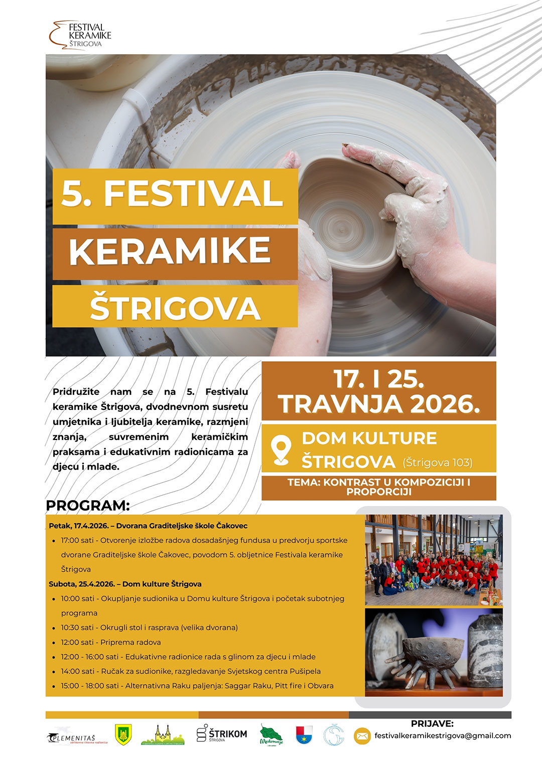 Pozivamo Međimurke i Međimurce te sve zainteresirane da posjete izložbu radova u dvorani Graditeljske škole Čakovec, kao i na druženje i upoznavanje kreativnih likovnih tehnika umjetničke keramike u Domu kulture Štrigova. Festival keramike Štrigova njeguje spoj tradicije, suvremenih umjetničkih praksi i edukacije, a uz bogat program nudi i prostor za razmjenu znanja, iskustava i kreativno druženje u jedinstvenom ambijentu međimurskih brežuljaka.
