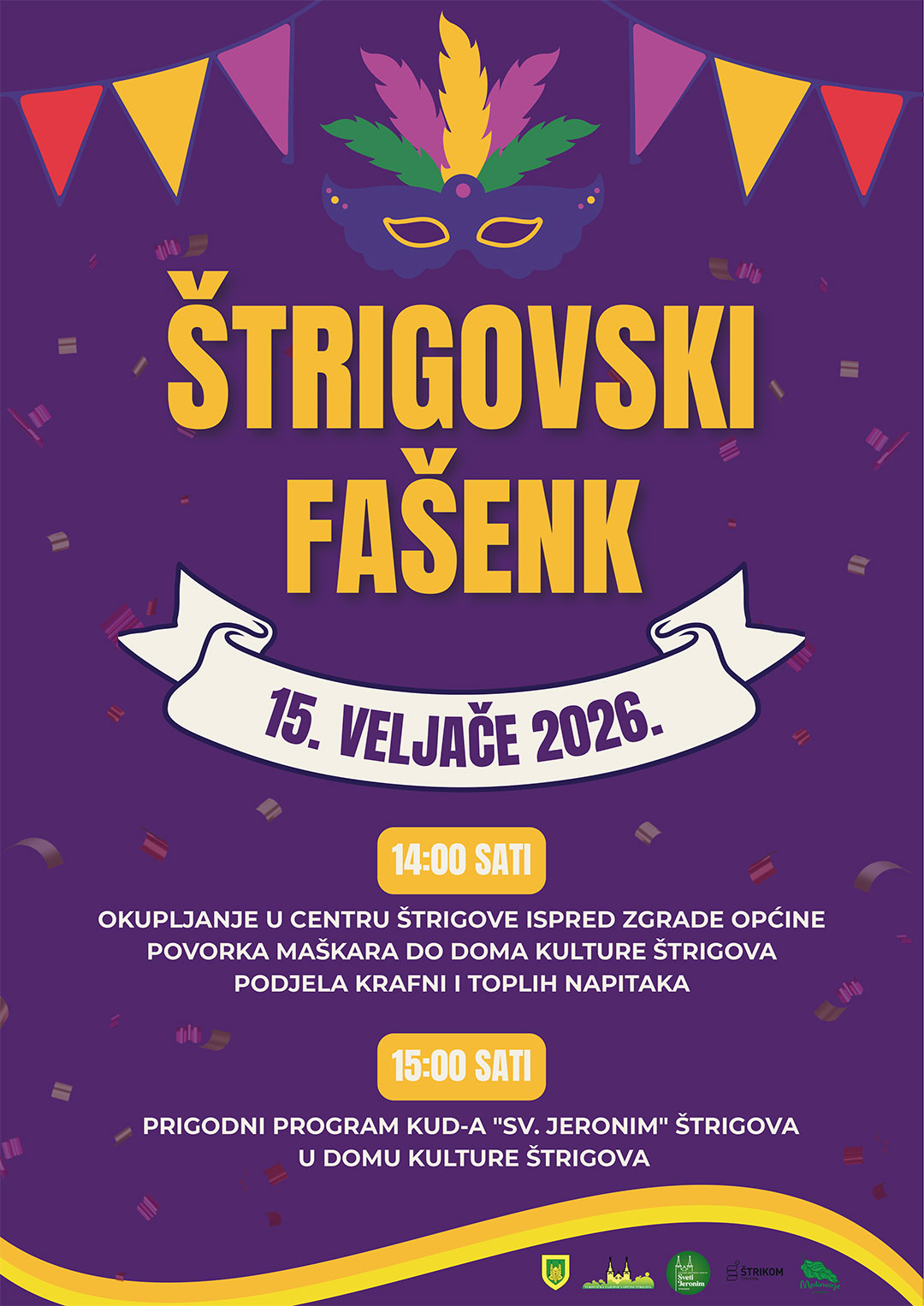 Okupljanje maškara predviđeno je u 14:00 sati u centru Štrigove, ispred zgrade Općine, odakle će krenuti šarena povorka prema Domu kulture Štrigova. Povorku će pratiti Muzikaši seh vetrov, koji će svojim glazbenim ritmovima dodatno podići fašensko raspoloženje. Po dolasku u Dom kulture, maske i skupine imat će priliku predstaviti se publici, a za sve sudionike i posjetitelje bit će osigurane krafne i topli napitci.