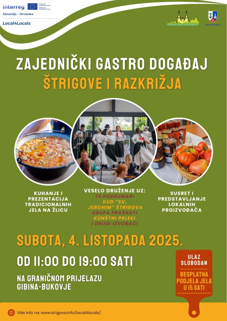 U subotu, 4. listopada, od 11 do 19 sati, na bivšem graničnom prijelazu Gibina–Bukovje održat će se Zajednički gastro-događaj Štrigove i Razkrižja u okviru projekta Local4Locals, koji potiče prekograničnu suradnju i jačanje povezanosti lokalnog stanovništva Štrigove i Razkrižja.